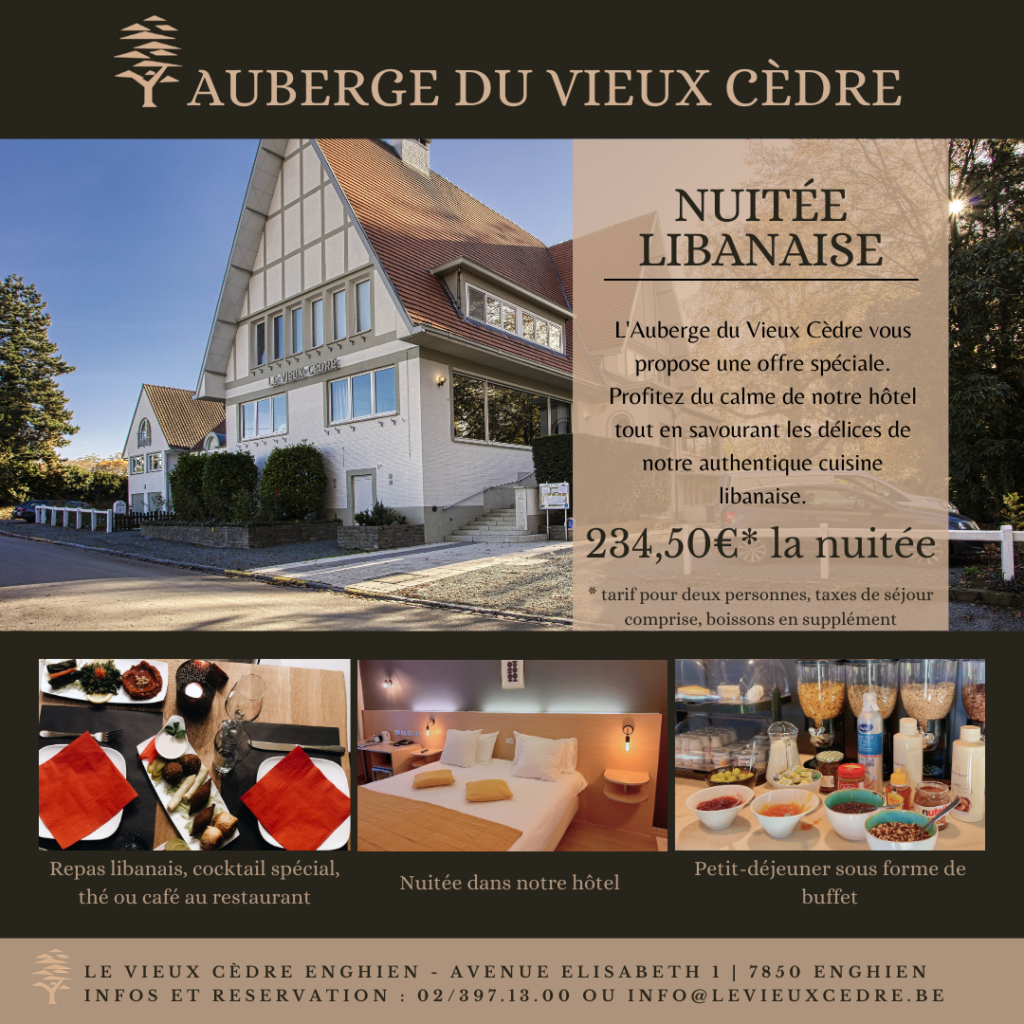 Promotions Découvrez toutes les promotions et événements du Vieux Cèdre. Bien plus qu’un hôtel et un restaurant, le Vieux Cèdre est un lieu de rencontre et de partage avec des services variés et uniques à Enghien ! Réservez-votre séjour ! Facebook Instagram Tripadvisor Pour suivre l’actualité du Vieux Cèdre, rendez-vous sur notre page Facebook et Instagram où toutes nos nouvelles offres et promotions sont publiées en avant première.